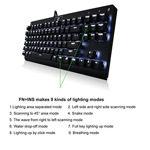 White Backlit display,FN+INS can make 9 kinds of lighting mode can be choosed;Support customizable keys lights with FN+(9,0) to make lights of some keys on and others off