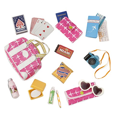 - INCLUDES 17 PLAYABLE ACCESSORIES – this set includes 1 travel bag, 1 Our Generation passport, 1 passport case, 1 boarding pass, 1 boarding pass cover, 1 train ticket, 1 pair of heart-shaped sunglasses, 1 sunglass case, 1 camera, 1 deck of playing cards, 1 body lotion container, 1 tube of toothpaste, 1 toothbrush, 1 soap dish, 1 bar of soap, 1 bag of crackers, and 1 chocolate bar.