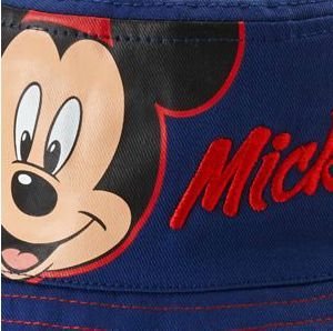 -. Feature : Comfy, bucket cotton sun is the perfect sun protector for your little man / Sized for infants in navy blue with Mickey Mouse print / Red embroidered eyelets / Thin gray trim