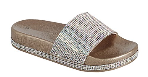Product DescriptionThis slide sandal from Cambridge Select features a thick single vamp strap, crystal detailing, and a flatform sole. Imported.0