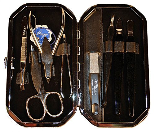 Studio : Budd Leather Company Publisher : Budd Leather Company Binding : Misc. Product Description Includes cuticle knife, cuticle pusher, nail cleaner, sapphire file, tweezer, cuticle nipper and nail scissor. Classic framed leather case. Chrome plated implements. Made in Germany. 3.5 in. W x 6 in. H. 0