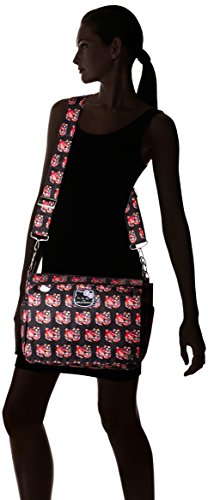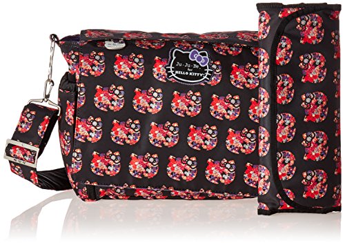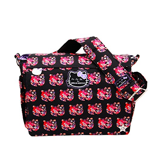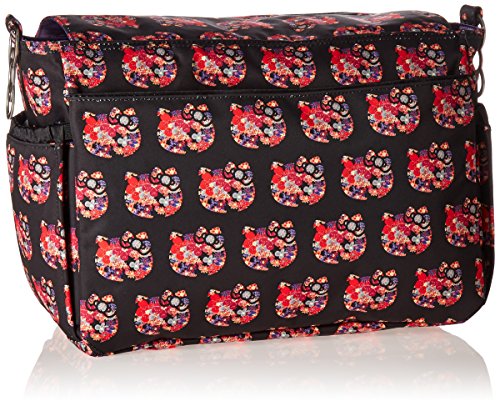 The Ju-Ju-Be Hello Kitty Collection Better Be Messenger Diaper Bag is a smart bag that has an innovative design and a number of pockets for extra versatility. Is your diaper bag machine washable? It better be. Is your diaper bag lined with light colored, antimicrobial linings? It better be. This messenger style diaper bag is perfect for any mom or dad on-the-go. The outer fabric is treated with Teflon fabric protector, making it easy to repel stains and keep your Better Be bag clean. The front "mommy" zippered pocket is large enough to hold smartphones, wallets, keys and other personal items. Inside are (2) smaller zippered pockets with a sunglass case, lipstick loop and key fob stretch cord. The main pocket is large enough for a supply of diapers, wipes, soft toys, extra clothes and other items for a quick trip away from the house. Bottle pockets are located on either side of the bag and insulated by 3M Thinsulate to keep all your items hot or cold. Located on the external flap is a zippered pocket, perfect for storing a few additional diapers. The back pocket is designed with crumb drains to keep the better be clean. The back pocket also contains a matching memory foam changing pad. This bag is machine washable and measures 14-inches by 11-inches by 5.5-inches in size. The Hello Perky print is a multi-colored Hello Kitty logo pattern on a black background with purple lining. The print is accented by silver, metal hardware. All Ju-Ju-Be items come with a Lifetime Limited Warranty against manufacturing defects when purchased from an Authorized Ju-Ju-Be Dealer. Authorized Dealers can be found in the images. Founded in 2005, Ju-Ju-Be is a Southern California company that uses science, style, and attitude to create diaper bags, purses and other fashionable accessories. Ju-Ju-Be assimilated the most advanced technology possible to create a stylish and intelligent product line that's unrivaled in the industry.Feature
