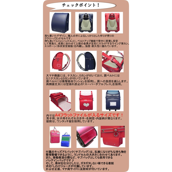 ●키즈 AMI 팩:난잡하게 되어 쉽상인 소지품을 정리 정돈할 수 있도록,란도세루(초등학생이 어깨에 매는 가방)의 크기 에 따라 있습니다.또한이동 교실의 때 등,서브 백으로서도 사용 할 수 있는 백 인 백입니다♪ ●원터치정:하(아래)의 툭 튀어나옴 부분을 가볍게 누르면 자동으로 안주가 잠거집니다.짐의 분량에 2단계 조절 를 할 수 있습니다.해정시에는,중앙의 안주를 시계방향으로 90°줌홉. ●반사 부착에 밤길에서도 안전:사내 아이 버젼은,씌워 정면,마치(깊이,폭)량 싸이드에 반사재가 붙고 있습니다.소녀 버젼은,씌워 정면,마치(깊이,폭)량 싸이드에 반사재가 붙고 있습니다.밤,어두운 길에서도 라이트에 반사해 존재를 알립니다. ●원 포인트 장식:소녀 버젼은,명함창,측면,하트를 중심으로 했 작고 예쁘장스러운 장식을 해 있습니다. 문고리,대갈못으로도 하트가 무심코(그만) 있습니다. 사내 아이 버젼은,성타입의 대갈못과 사용하고, 문고리는 안주 쉬운 두께인 만들기 이 되어 있고,KIDs AMI 의 로고 들어감입니다.명함창은,크게 보기 편리해지고 있습니다. ●배벨트의 조정:벨트의 길이는 매우 중요합니다.제대로 조정 하지 않는과 견등에 부담이 걸립니다.몇 번이나 조정해 베스트의 위치를 발견해 하십시오.벨트의 구멍에 금구의 핀을 남길 때는 사진과 같이 금구의 뒤편 에 있는혈에 통하고 나서 금구로 통합니다. ●슈퍼 더블 프레스:본체 마치(깊이,폭)의 상부에 엠보스 가공 된 특수 플레이트를 설치 전후의 압력부터 형붕괴를 방지합니다.