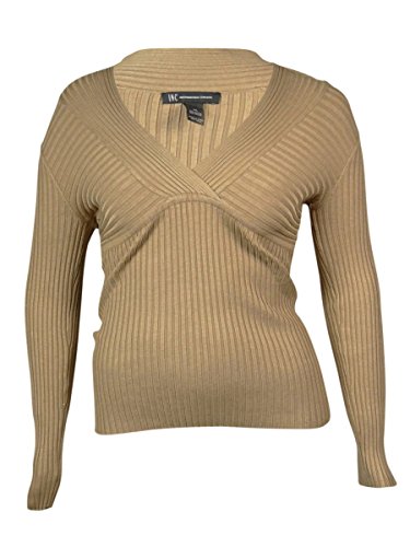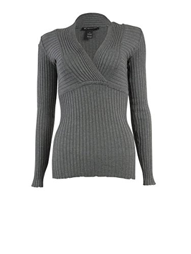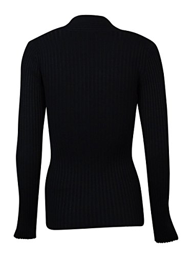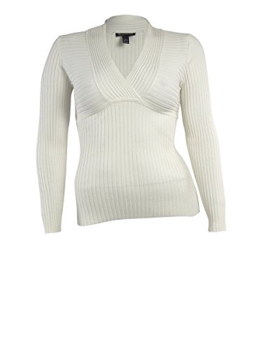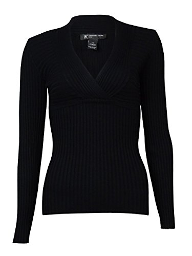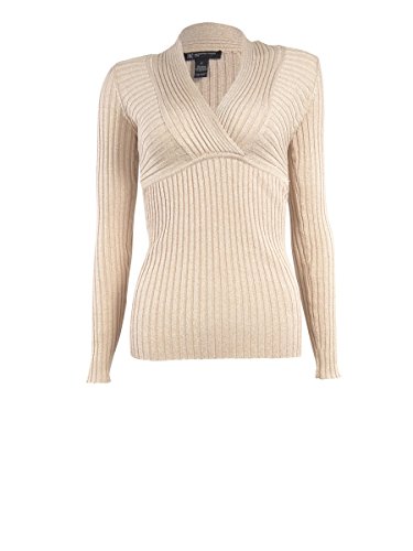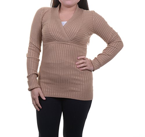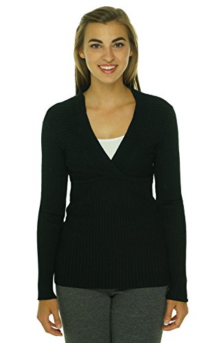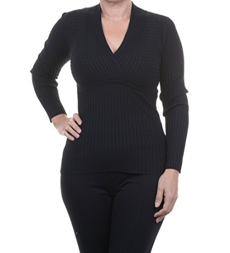 Sweater features no lining, V-neckline, long sleeves, ribbed rayon blend fabric, and pullover style.