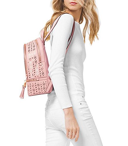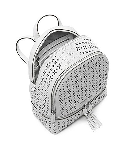 -. Binding : Apparel -. Brand : -. Department : womens -. Feature : MK signature PVC; lining: polyester / Exterior features gold-tone hardware, logo, 2 zip pockets and allover perforation / Interior features lining, 1 zip pocket, 3 slip pockets and 1 key chain / 2"L top handle; 14-1/2"L to 17-1/2"L adjustable backpack straps / Medium sized bag; 13"W x 10-1/2"H x 5"D -. ProductGroup : Shoes -. ProductTypeName : BAG -. Size : Medium -. Title : MICHAEL Rhea Perforated Zip Medium Backpack