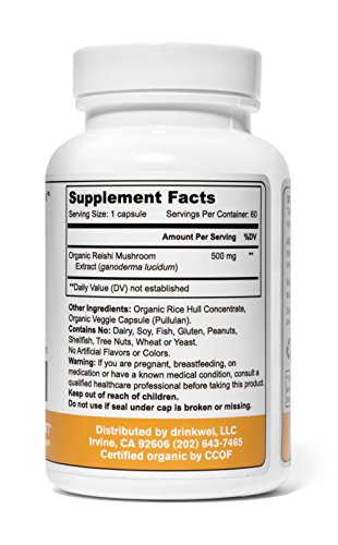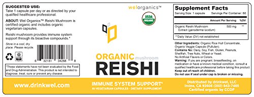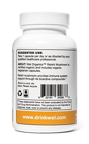 -. Binding : Health and Beauty -. Brand : drinkwel -. EAN : 0632181342688 -. Feature : Wel Organics Reishi Mushroom is certified organic and includes organic vegetarian capsules. / Organic Reishi Mushroom provides immune system support through its bioactive compounds.* / Each Organic Reishi Mushroom bottle contains 60 vegetarian capsules, or 60 servings. / Made in California, USA | Gluten Free | Vegetarian | No Artificial Flavors or Colors / We guarantee our Organic Reishi Mushroom product will make you feel healthier or we will give you all your money back, including shipping. If you aren't happy, contact us and we will take care of you RIGHT AWAY! -. IsAdultProduct : 0 -. Label : Drinkwel -. LegalDisclaimer : *This product does not prevent intoxication, alcohol poisoning, alcohol abuse, or utter stupidity. Please drink responsibly. Never drink and drive! Do not consume alcohol if you are not of the legal age to do so, while pregnant or nursing. This product is not intended to diagnose, treat, cure, or prevent any disease.* -. Manufacturer : Drinkwel -. MPN : 1 -. PackageQuantity : 1 -. PartNumber : 1 -. ProductGroup : Health and Beauty -. ProductTypeName : HEALTH_PERSONAL_CARE -. Publisher : Drinkwel -. Studio : Drinkwel -. Title : USDA Certified Organic Reishi Mushroom Extract (Vegetarian Capsules) -. UPC : 632181342688
