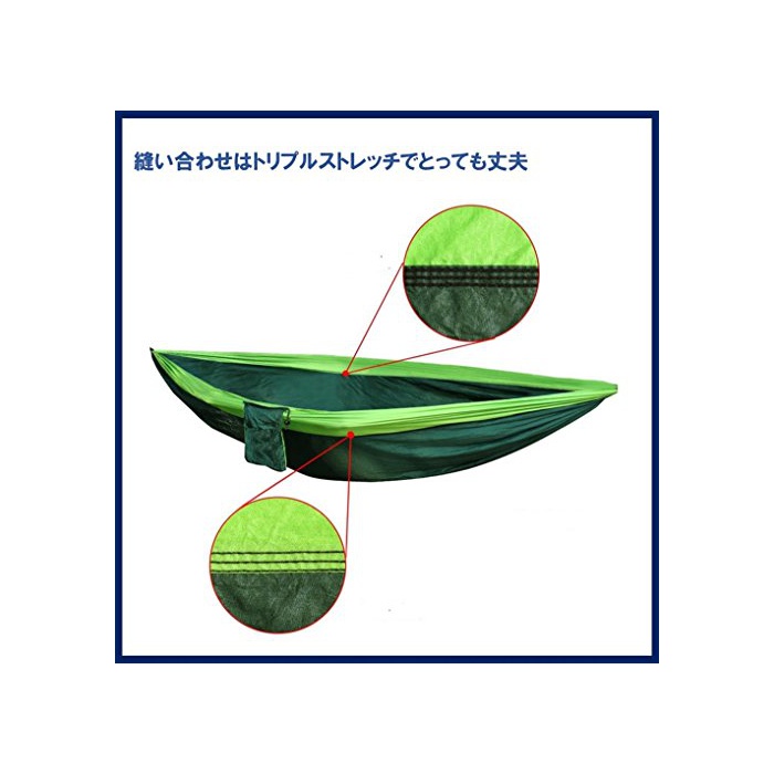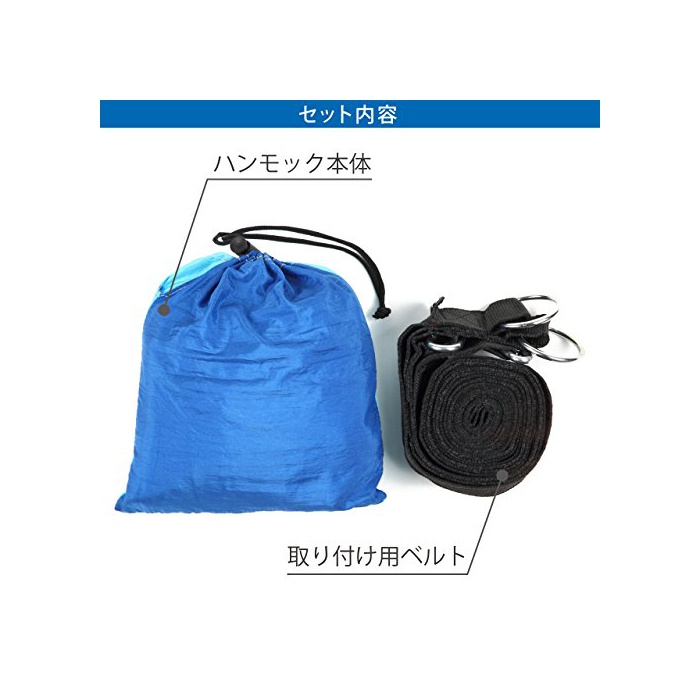 【사이즈】 2명 용 【베드부】 약270×140㎝ 【전장】 약290㎝ 【내하중】 150kg 【소재】 나일론100% 【부속품】 카라비너,고정용 로프,수납 대부속