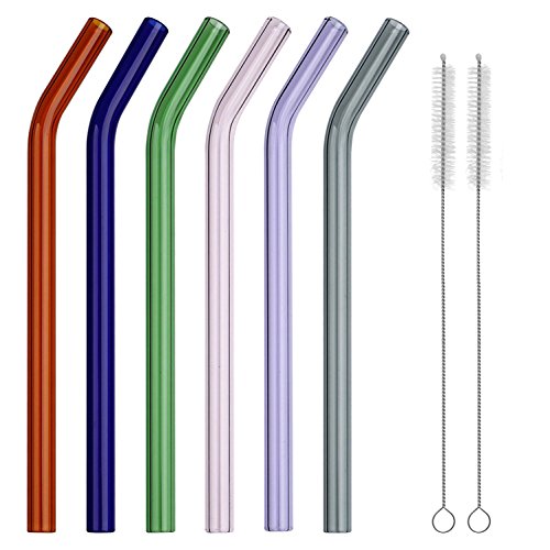 -. Title : Folox Bent Reusable Glass Drinking Straws 8 in x 10mm with 2 Cleaning Brush, Pack of 6, Included Blue, Green, Grey, Orange, Pink, Purple