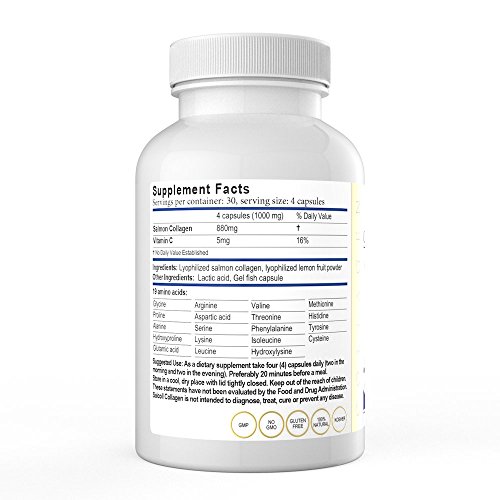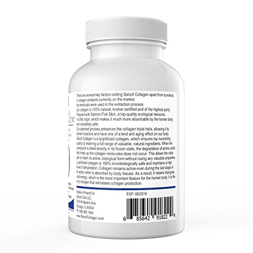 -. Feature : • PURE MARINE COLLAGEN: Salcoll Collagen Skin Capsules, unlike most other anti-aging products & skin care supplements out there, use pure & naturally extracted marine collagen with vitamin C; Highly bioactive salmon collagen for exceptional skin care / • STIMULATES COLLAGEN PRODUCTION: Our bespoke extraction processes retain the bioactivity of marine collagen so that it gets easily absorbed into skin tissue & stimulates the natural collagen production in your body for better results / • GET RID OF WRINKLES: In contrast with common skin care & anti-aging products, Salcoll Collagen Skin Capsules offer you the most natural way of getting rid of wrinkles & fine lines by boosting collagen production; 100% natural marine collagen; Kosher Certified / • DEEP SKIN HYDRATION: Since these anti-aging supplements feature pure & lyophilized collagen, they offer remarkably thorough & long-lasting deep-skin hydration to go with the anti-aging benefits of collagen; For smooth, supple & youthful skin / • HAIR, SKIN & NAILS HEALTH: Increased collagen production in your body leads to overall hair, skin & nails health improvement; Stop relying on chemical-laden skin care products & reap the benefits of pure, natural collagen; Click 'Add to Cart' & order right away