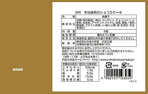 原材料:砂糖(国内製造)、卵白、マーガリン、チョコレート、小麦粉、水あめ、アーモンドプードル、抹茶、食塩/香料、膨脹剤、クチナシ色素、(一部に小麦・卵・乳成分・大豆を含む)