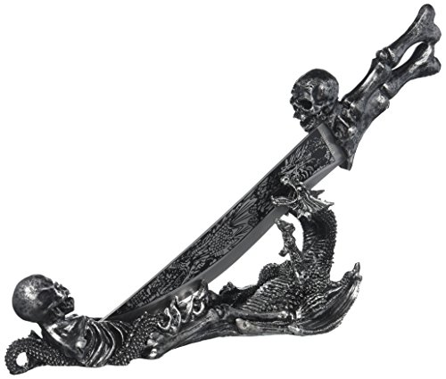 Ghoulish decorative dagger is destined to delight any fan of the dark side! A chilling demonic dragon design is featured along the wickedly curved blade, as well as the skeletal handle and frighteningly lifelike faux pewter stand.