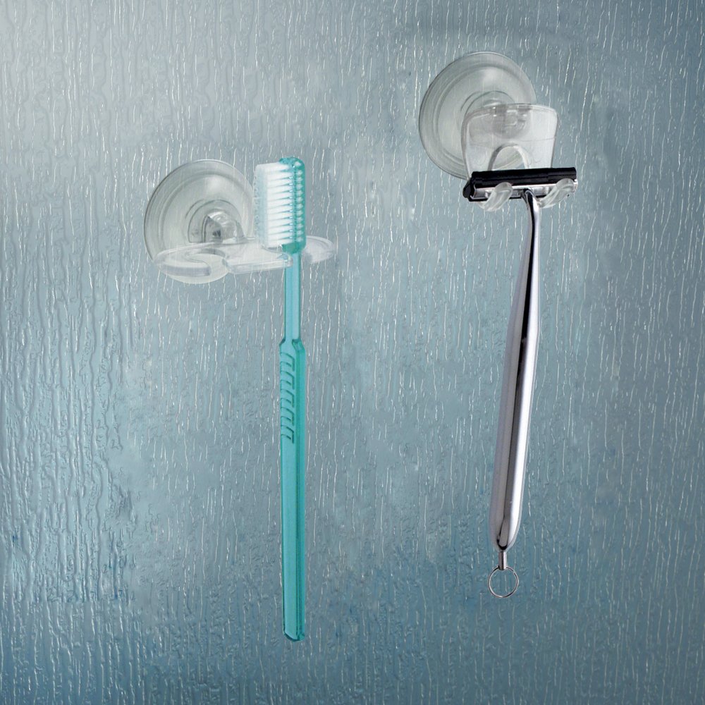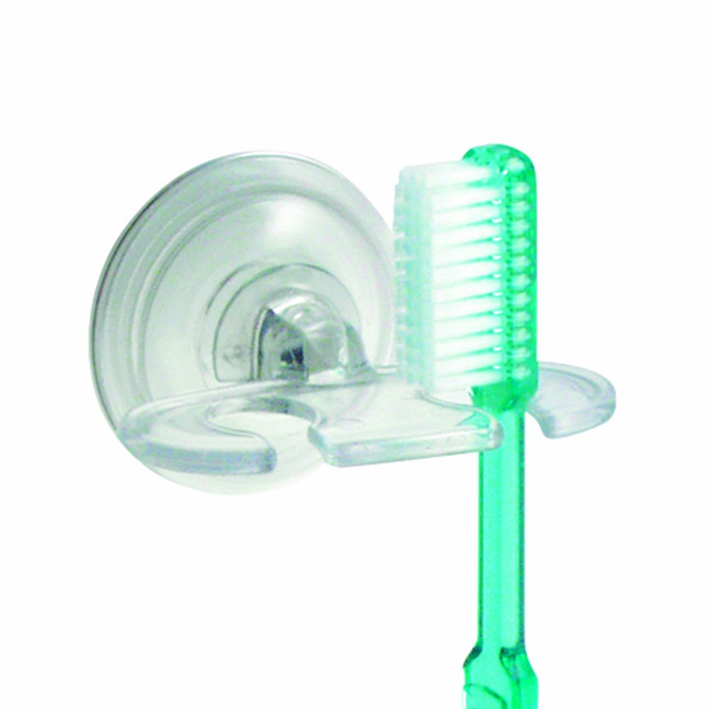 Power Lock accessories for kitchen and bath allow instant storage solutions with no mounting hardware required. Super strong suction cups lift, push and lock to securely adhere to smooth surfaces. This double toothbrush holder suspends two brushes, keeping them elevated and clean.