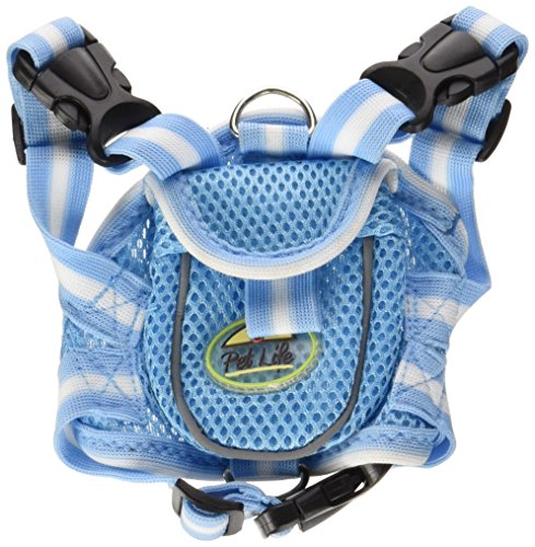 -. Binding : Misc. -. Brand : Pet Life -. Feature : Can help reduce strain on the neck and throat / Waterproof, windproof, breathable and lightweight / Light blue with white accents -. Label : Pet Life -. Manufacturer : Pet Life -. PackageQuantity : 1 -. ProductGroup : Pet Products -. ProductTypeName : PET_SUPPLIES -. Publisher : Pet Life -. Studio : Pet Life -. Title : Mesh Pet Harness With Pouch