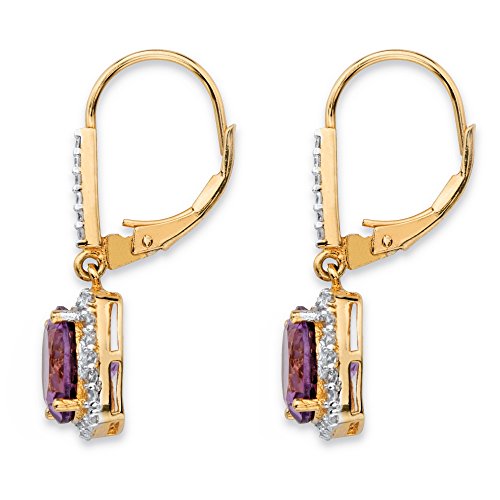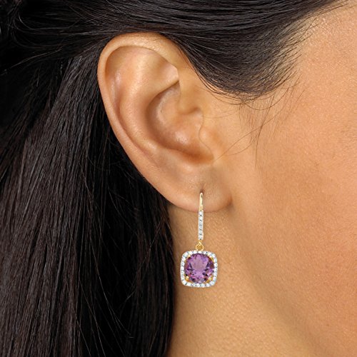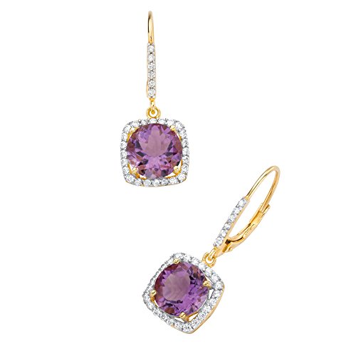These luminous purple genuine amethyst earrings sparkle with regal glamour and timeless fashion. Surrounded by a halo of sparkling white cz rounds that continue up the bale for even more glam appeal, these beauties will be your favorite style finishers. 6.04 carats T.W. with lever backs to keep them secure. Crafted in 14k yellow gold over sterling silver. - 58727Feature