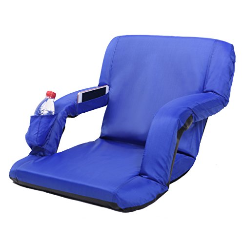 AceLife Stadium Seat Portable Reclining Bleacher Chair with Cup Holder and Phone Pocket, Blue Specifications: - Cover Material: 420 Polyester;bottom fabric:pvc leather - Steel tube: Dia0.75*0.04inch - Multiangle: 5 Position - Product Size(LxWxH): 32*20*2inch - Gross Weight: 7.5lb -Package: 1xFloor Armchair Description: This comfortable, portable padded seat is so versatile, Enjoy reclining at the beach, sitting at the park, sporting events, camping, bleachers and more ,It comes with 5 reclining positions, adjustable backpack style straps for easy carrying and padded armrests for extra comfort. It can be adjusted to completely flat so you can easily store it in your closet or just place it under your sofa when you don't use it.