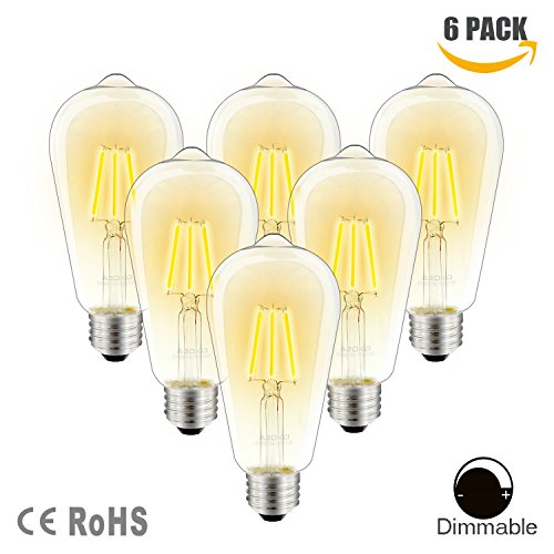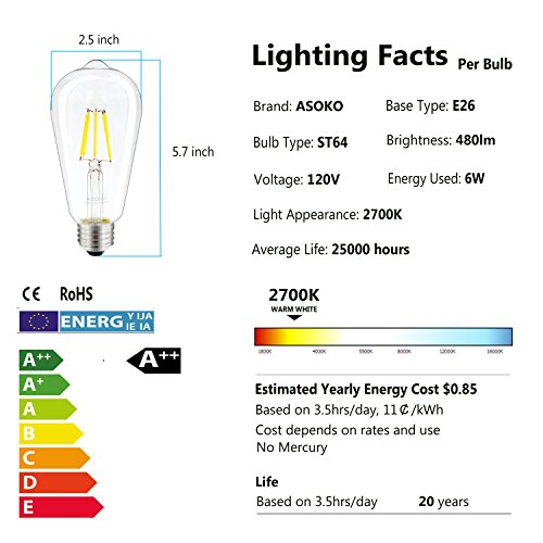 - 【Vintage LED Bulb】: Led Edison LED 6W bulb, 2700K, 480lm, ST64, E26 base,50W incandescent bulb equivalent.