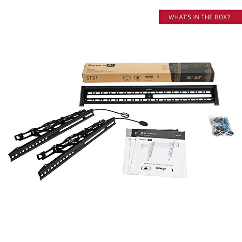 -. Binding : Electronics -. Brand : Seneca AV -. Color : Black -. EAN : 0800152714639 -. Feature : Fits most flat panel TVs from 32" to 60", TVs that weigh up to 80 lbs. (36 kg) / +12 Degree tilt angle from accessible tilt mechanism. Works with VESA sizes from 100x100 to 600x400 / 27.6" dual stud wall plate for up to 24" stud spacing. Bracket sits 1.5" from the wall / Durable black powder coated finish, steel construction / Install manual, mounting hardware for wood and/or concrete installation included. -. Label : Kanto Distribution Inc. -. Manufacturer : Kanto Distribution Inc. -. Model : ST31 -. MPN : ST31 -. NumberOfItems : 1 -. PackageQuantity : 1 -. PartNumber : ST31 -. ProductGroup : Speakers -. ProductTypeName : AV_FURNITURE -. Publisher : Kanto Distribution Inc. -. Studio : Kanto Distribution Inc. -. Title : Seneca AV ST31 Low Profile Fixed TV Mount for 32"-60" Flat Screen Displays - 12 Degree Tilt - VESA Compliant - Built-in Bubble Level Included -. UPC : 800152714639 -. Warranty : 2 year manufacturer warranty
