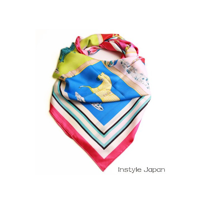 실크 100% 대형 스카프 스톨 고급 새틴 바탕이 두꺼운 것 【 말과 리본 】 핑크 청 블루 명주 UV 방한 135×135cm [Instyle Japan]