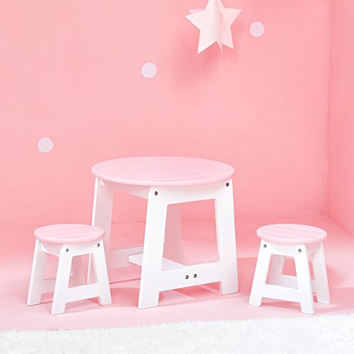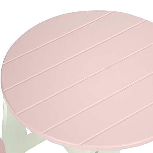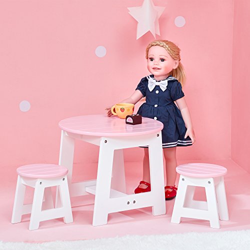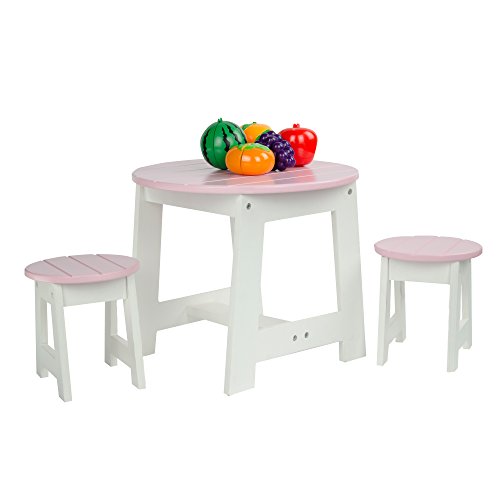 Bring your dolls out of the house on a beautiful day for a picnic or barbeque with the outdoor table and chair set! Circular light pink table top with white base is a great place to store all of your picnic needs! Comes with two matching stools.