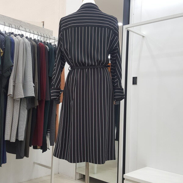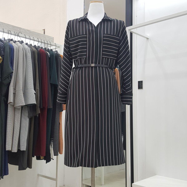 스트라이프 패턴으로 날씬해 보이고 옵션 벨트로 허리라인을 강조하여 정장 느낌을 주는 원피스입니다. 앞 지퍼여서 오픈하여 아우터로 입으셔도 좋고 입고 벗기가 편안한 셔츠형 원피스입니다.