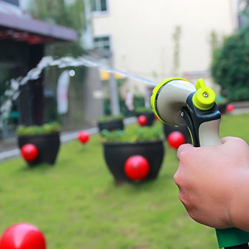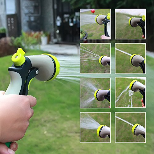 -. Feature : 8 Spray Modes - Select from 8 different spray modes to suit your needs. Choose from Mist, Shower, Rinse, Flat, Soaker, Cone, Jet and Center modes. These different modes make this device perfect for washing cars, watering plants, washing pets or cleaning pool and yard areas. / Regulation Valve - By rotating the water regulation valve you can easily adjust the flow rate and water pressure. Switch between a light shower and a thundering, high-pressure jet in no time at all. Easily find the right pressure and flow rate for the task at han / Ergonomic, Slip-Resistant Handle - The handle has been designed ergonomically for your comfort and has been coated in an anti-slip material. The handle is so comfortable that you won't get tired whatever you are doing. / Excellent Build-Quality - The nozzle has been made from the highest-quality materials so it's sturdy and robust. It has been built to last and to work hard for you. / Built-In Sealing Pipe - The nozzle has been equipped with a built-in sealing pipe which can be attached to almost any hose and prevents leakage.