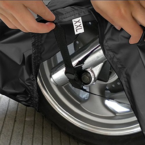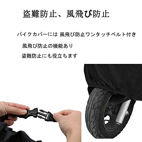 【盗難防止】:バイクカバーの底部がソケットの設計を採用しております、ゴムの伸縮性により、前後が勝手に絞られます、しっかりオートバイクを巻き付けて、強い風飛び防止ができます、また、ワンタッチベルトが付き、盗難防止に役立ちます。