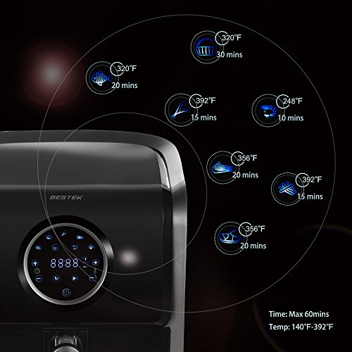 Easy Operation : LED touch screen with 7 built-in preset programs: Fries/Chips, Steak, Chicken, Chops Fish, Shrimp and Cake or or set cook time and temperature manually.