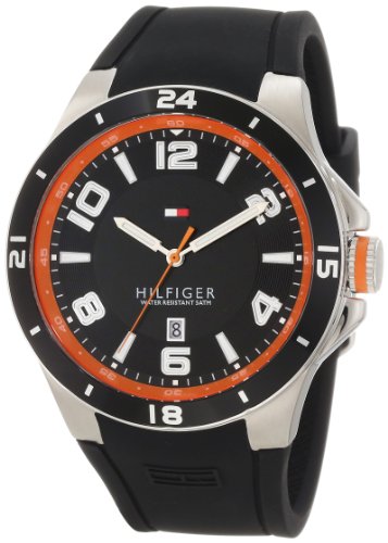 -. Binding : Watch -. Brand : Tommy Hilfiger -. Color : Black -. Department : mens -. EAN : 0885997042123 -. Feature : Quartz movement / Sport stainless steel case with integrated black silicon strap / White arabic numerals / Durable mineral crystal protects watch from scratches, / Water resistant to 165 feet (50 M): suitable for swimming and showering -. Label : Tommy Hilfiger -. Manufacturer : Tommy Hilfiger -. Model : 1790861 -. MPN : 1790861 -. PackageQuantity : 1 -. PartNumber : 1790861 -. ProductGroup : Watch -. ProductTypeName : WATCH -. Publisher : Tommy Hilfiger -. ReleaseDate : 2012-08-25 -. Studio : Tommy Hilfiger -. Title : Tommy Hilfiger Men's 1790861 Sport Bezel and Silicon Strap Watch -. UPC : 885997042123