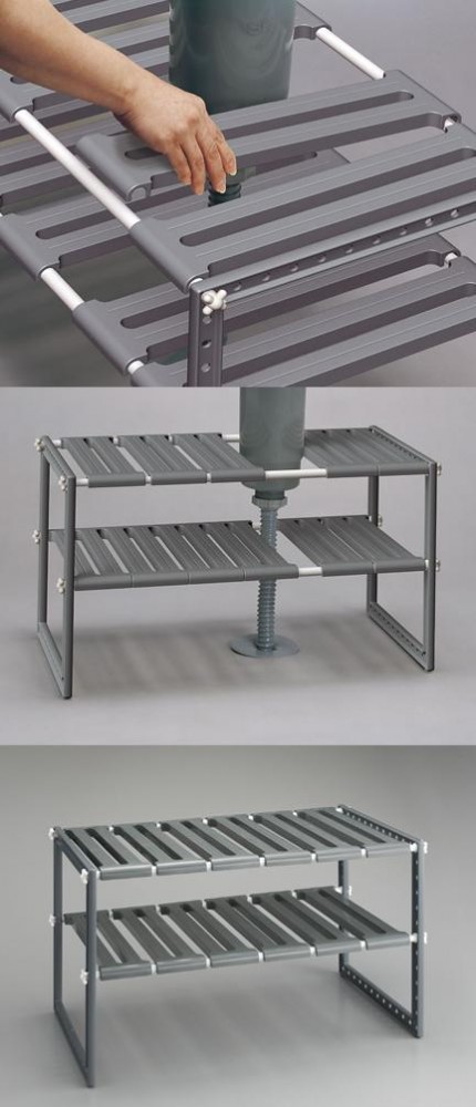 鍋ふたやざるが収納できるシンク下フリーラックです。排水トラップを避けて棚が作れます。 |