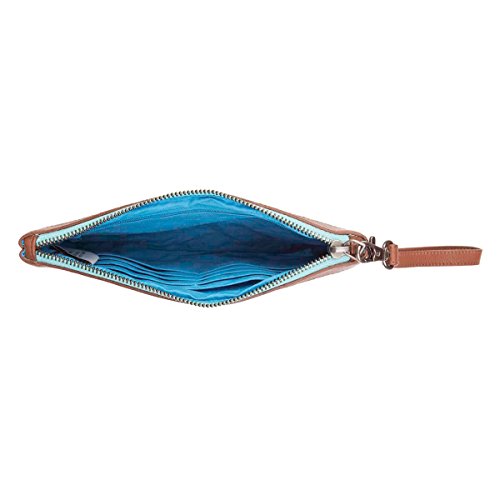 Product Description Fashionable, yet accessible, the Sierra Wristlet Pouch has a roomy interior perfect for holding lipstick, a large cellphone, gum and keys, with secure slots hidden on the side to keep cash and cards organized. Inspired by the coast and sunny days, Sierra is a bright and casual look that's a great choice anytime. Features unfaded cornflower blue, aqua, marshmallow creme, copper leather wrist strap and pewter hardware. Wristlet Pouch: H 5.5" Base: W 9" x D 1". 1 wrist strap 12" x 0.375". 1 zip, 8 card slots, 1 cash slot inside. Lined in microfiber. 0
