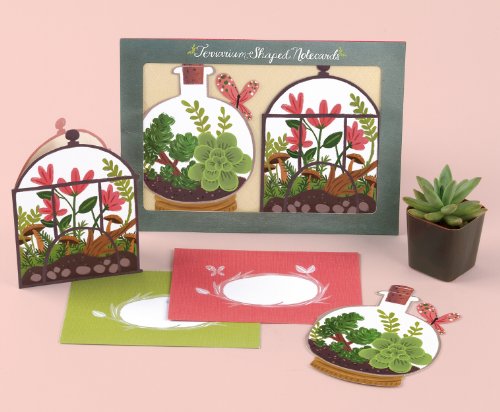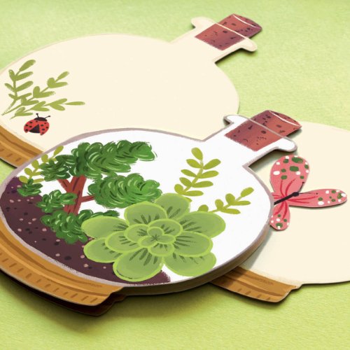 Galison's Terrarium Shaped Notecards are sets of die-cut cards illustrated by Quill & Fox Design. One card shows a cork-stoppered bottle filled with succulents, a curious butterfly looking in. The other shows a humid woodland scene with flowers, ferns, and toadstools. You can practically smell the rich scent of the soil!
