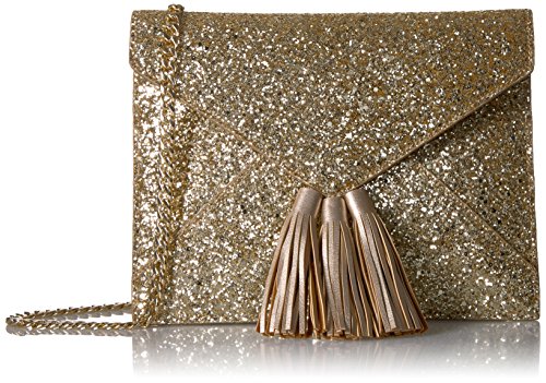 Product DescriptionA gleaming glitter front and metallic tassels give this crossbody clutch show-stopping style0