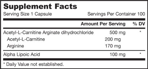 Acetyl-L-Carnitine Arginate and Alpha Lipoic Acid (ALA) support the mitochondrial production of energy.* Acetyl-L-Carnitine is found in high concentrations in human brain; nerve; heart; liver and sperm cells; where it participates in metabolizing fatty acids into energy by the mitochondria.*Alpha Lipoic Acid is a water and lipid soluble antioxidant required by the mitochondrial matrix pyruvate dehydrogenase complex; which is the starting point of the Krebs or TCA (energy) cycle.*Acetyl-L-Carnitine Arginate and Alpha Lipoic Acid work synergistically as antioxidants.* Acetyl-L-Carnitine Arginate Dihydrochloride is manufactured by Sigma-Tau Industries; S.p.A. (Rome; Italy); the pioneer in L-Carnitine science under U.S. patent # 6;703;042 and Worldwide patent # EP1;202;956.Keep out of the reach of children.Feature
