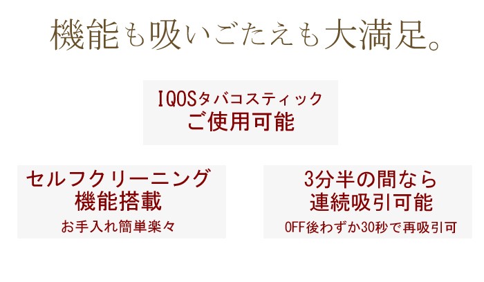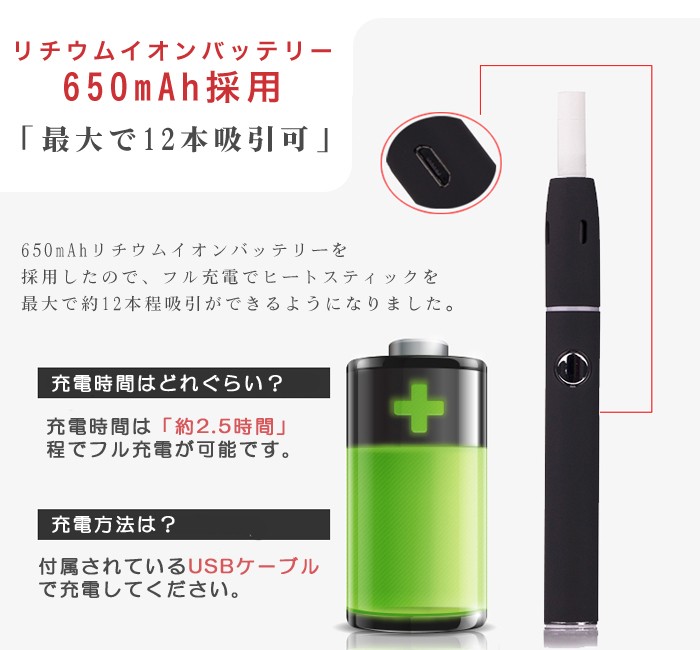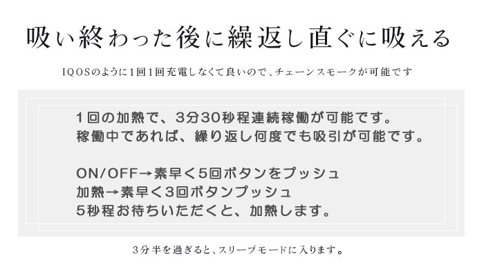 【仕様】 ■電源オン: 素早くスイッチを5回押すと、 白いライトが3回点滅し電源が 「オン」になります。 電源オフ:素早くボタンを5回押すと、 赤いライトが3回点滅し電源が「オフ」になります。 ■バッテリー残量表示: ボタンを1回押すとバッテリー残量が表示されます。 緑ライト→白ライト→赤ライト→赤ライト点滅 ■吸引方法: 1.スイッチを3回押すと白ライトが点滅。 加熱ブレードの加熱が始まります。 吸引できる温度まで 加熱ブレードが加熱されると白ライトが点灯し、 赤ライトの点滅表示まで約3分半程度。吸引が可能になります。 2.吸引を中断する場合にはスイッチを3回押してください。 白ライトが消灯し、加熱が中断されます。 ■スリープモード: 過熱の3分半程経ってから、30秒のスリープモードに入ります。 ・スリープモード時、再度スイッチを3回押すと10回ライトが点滅し 本体停止となりますが、30秒後にまた吸引できる状態に戻ります。 ・加熱されている状態でスイッチを3回押すと電源がオフになり、 本体がスリープモードになります。 30秒後にまた吸引できる状態に戻ります。 ■クリーニング: 動作が停止している状態で5秒間スイッチを押し続けると 赤と白のライトが交互に点滅します。 ライトが点灯すると本体が過熱しながら セルフクリーニングを行います。 30秒後、ライトが消灯しクリーニング完了します。 【ご使用上の注意】 ※連続吸引のご注意 連続吸引の際は3分程度空ける事を目安にご使用下さい 連続吸引により熱が上がり過ぎてしまいますと自動制御スイッチが ONになり電源が入らなくなることがあります。 また、過度の連続吸引は故障の原因となります。 ※吸引本数などの記載情報数値関連はあくまで基本水準となり 使用頻度や経年劣化等により変化する場合があります。 ※ 充電はパソコン等のUSB端子につないで充電してください。 ※ 本体が熱い状態で吸い殻を出すのは火傷等の危険がありますのでご注意ください。 ※ 製品は子供の手の届かないところに保管してください。 ※ 煙は20歳から。未成年者の喫煙は法律で禁止となります。 ※神経質な方・身体問題を気にされる方はご遠慮ください。 ※ヒート時間に関してはあくまで参考にして下さい。 --------------------------------------- ※仕様および外観は製品改良のため予告なく変更される場合がございます ※輸入品の為、多少の汚れ、スレがある場合がございます。