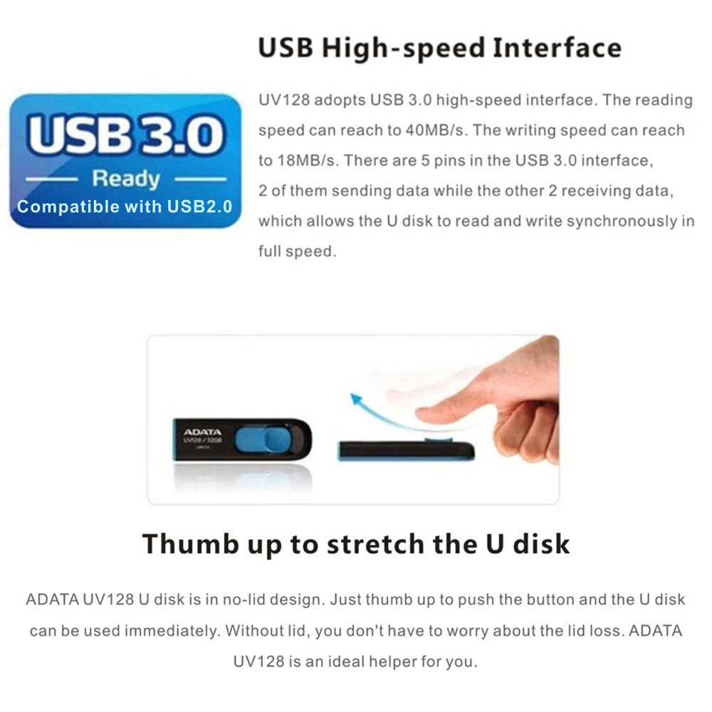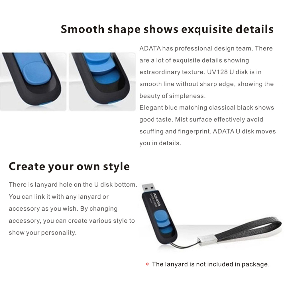 ADATA UV128 USB 3.0 provides 40MB/s maximum reading speed and 20MB/s maximum writing speed. With high speed, no-lid structure and lanyard hole design, it moves you in practical details. Combining convenience and fashion 2 in 1, it makes your digital life joyful.