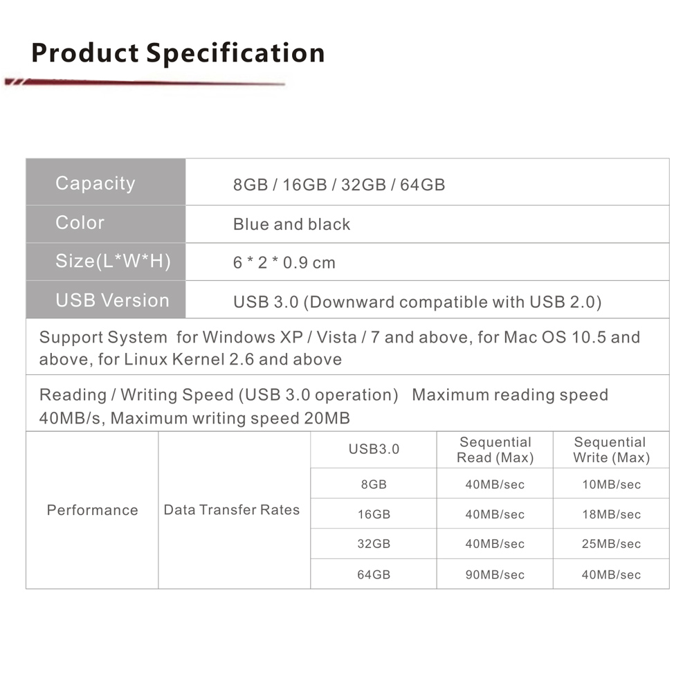 Provides 40MB/s maximum reading speed and 20MB/s maximum writing speed.