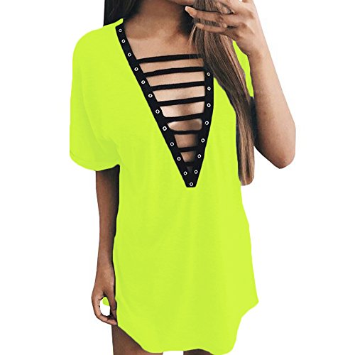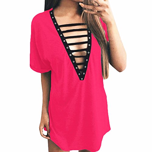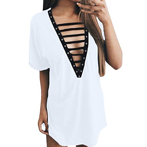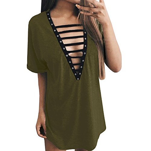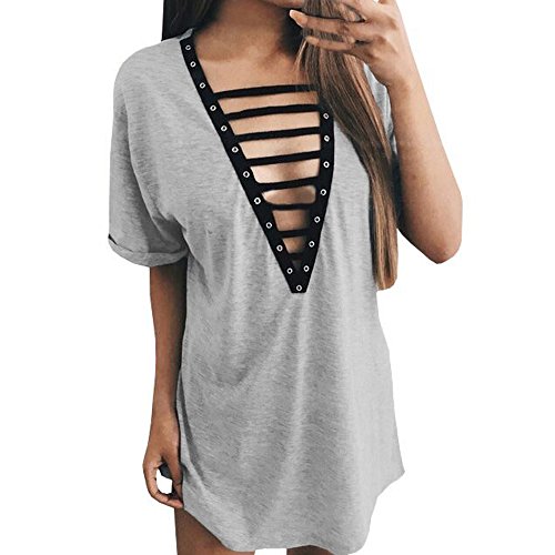 1×Geckatte Women's Short Sleeve Deep V-neck Lace Up Tops