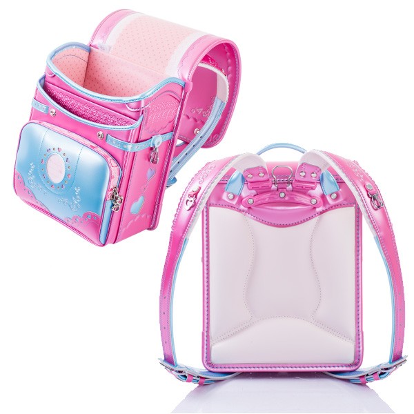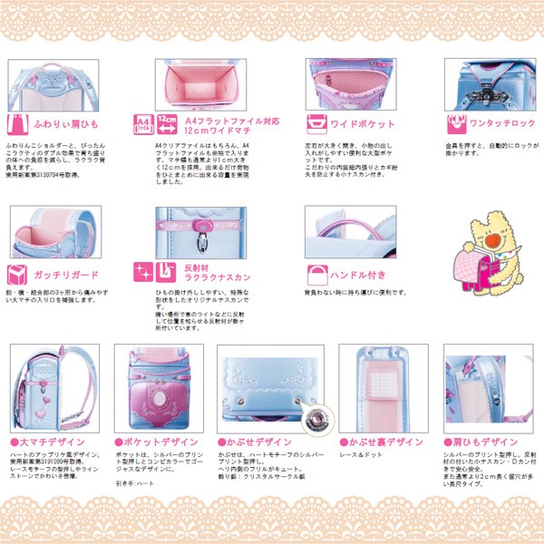 内装:ピンクドット、錠前:ワンタッチロック、補強:ガッチリガード、ポケット:ワイドポケット・内装総内張り・小ナスカン付、肩ベルト:ふわりぃ仕様・長尺・9穴・フリル型・箔押し・右(ハートカン)・左(小ナスカン)、鋲:クリスタルサークル、ナスカン:反射材付、冠裏:レース&ドット、反射材:冠下部・前締め・肩ベルト、固定型持ち手、カラー:パールピンク×パールスカイ