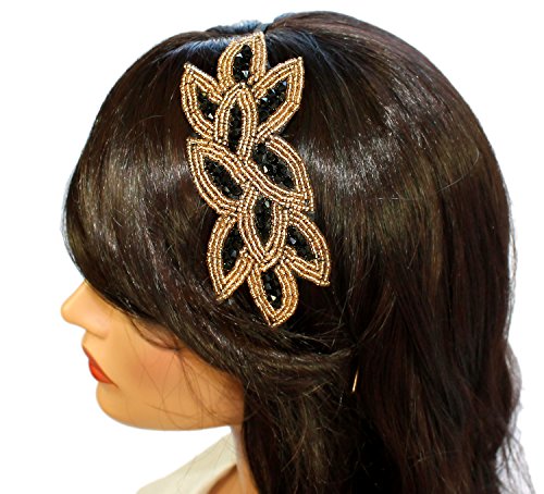 -. Binding : Misc. -. Brand : CB Accessories -. Department : Womens -. Feature : Headpiece inspired in 1920's fashion for adding a touch of class to any outfit / Beaded leaf portion measures 2 inches wide x 5 1/2 inches long / Hairband measures 1/4 inch wide x 15 inches long and it's not too tight making it very comfortable to wear / Metal band covered in fabric for a nicer look and extra comfort / Great accessory for everyday wear or for a special event -. NumberOfItems : 1 -. ProductGroup : Beauty -. ProductTypeName : BEAUTY -. Title : Beaded Flapper Headband Leaf Bunch Vintage Inspired Hairband Hair Accessory, Black