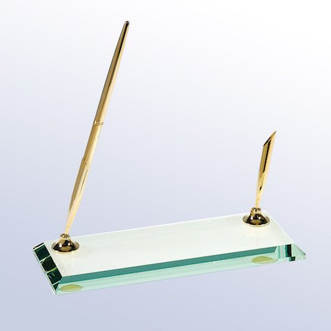 -. Title : Engraved Jade Glass Double Pen Desk Set Slant Edge