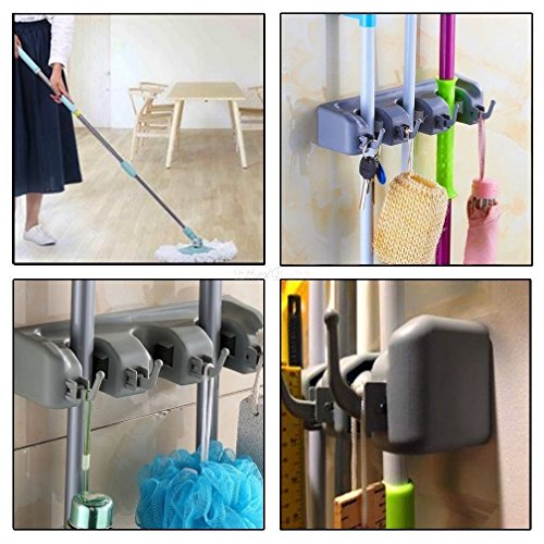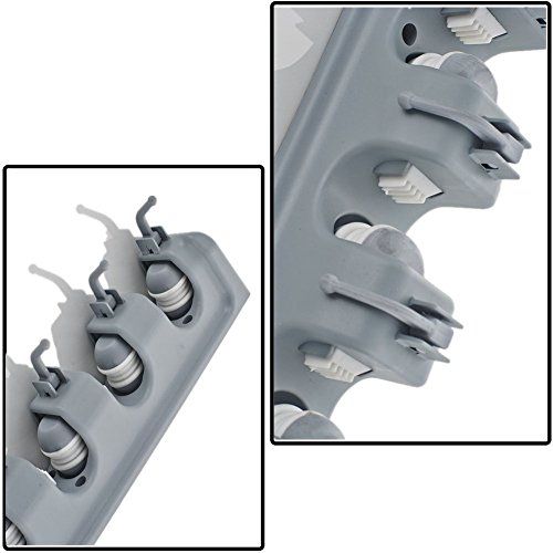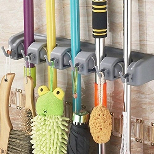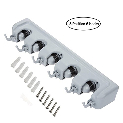 - EASY TO USE: Features 5 unique ball grip slots and 6 retractable hooks to hold your various household cleaning items and garden tools such as brooms, mops, rakes, spray bottles, dustpans, rags, brushes, and more. Rolling ball grip slot design automatically adjusts and securely grips onto varying handle thickness to allow for easy placement and release.