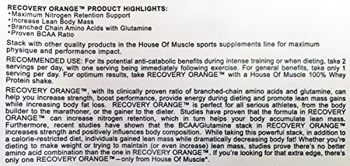 -. Binding : Health and Beauty -. Brand : House Of Muscle -. EAN : 0094922402516 -. Feature : BCAAs aid muscle repair and recovery / Encourages glycogen storage in muscles / Glutamine aids muscle growth / 27 delicious orange flavored servings per tub / Improves recovery by decreasing cortisol -. IsAdultProduct : 0 -. Label : House of Muscle -. LegalDisclaimer : The statements made about this product have not been evaluated by the FDA. This product is not intended to diagnose, treat, cure or prevent disease. -. Manufacturer : House of Muscle -. PackageQuantity : 1 -. ProductGroup : Health and Beauty -. ProductTypeName : HEALTH_PERSONAL_CARE -. Publisher : House of Muscle -. Studio : House of Muscle -. Title : Recovery Orange - BCAAs & Glutamine Supplement - 27 Servings -. UPC : 094922402516