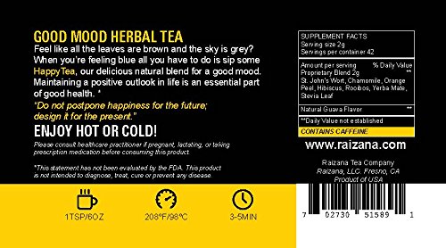 -. Binding : Health and Beauty -. Brand : Raizana Tea Company -. Feature : BEST VALUE! 3oz pouch makes 40 cups / We use the freshest herbs and you can smell and taste the difference as soon as you open the pouch. Effective and delicious natural remedy, served hot or iced. / Health Focus: Maintaining a positive outlook on life is an essential part of good health. Feel like all the leaves are brown and the sky is grey? When you're feeling blue all you have to do is sip some HappyTea, our delicious natural blend for a good mood. / Quality Ingredients: St. John's Wort (Hypericum) is used as a natural remedy for anxiety and depression. Yerba Mate is a pleasant stimulant with a boost of antioxidants. Hibiscus Petals give this blend tanginess, color, and flavor. Orange peel gives each sip the bright feeling of sunshine. / Effective & Natural: Mood-enhancing, pleasant stimulant, promotes mental well-being. St. John's Wort is used as a natural remedy for emotional health by providing natural herbs for anxiety and one of the top home remedies for depression. Herbal tea helps ease common tensions and nervous unrest. -. Label : Raizana Tea Company -. LegalDisclaimer : This information is not intended to diagnose, treat, cure or prevent any disease. -. Manufacturer : Raizana Tea Company -. ProductGroup : Health and Beauty -. ProductTypeName : HEALTH_PERSONAL_CARE -. Publisher : Raizana Tea Company -. Size : 3 Ounces -. Studio : Raizana Tea Company -. Title : Happy Tea: St. John's Wort Yerba Mate Hibiscus Herbal Tea Natural Remedy for Good Mood 3oz 40 Cups BEST VALUE