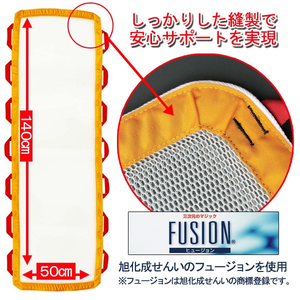 介護の現場では、介助する人の負担も大きいことは現代社会での大きな問題です。介護される人にも優しく、介助する人にも安全で確実にそして楽に使える「布担架」が生み出されました。日常の介護用具としてだけでなく、緊急搬送用の常備品としても活躍します。本体部分は、旭化成の3次元メッシュ構造「FUSION」を使用し、クッション性、通気性、均一な引っぱり圧を実現してます。持ち手部分は多数配置していますので、複数人が持ちやすいように工夫されてます。