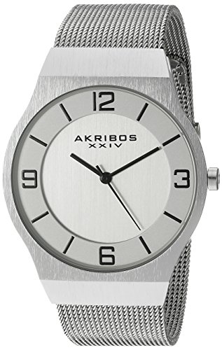 -. Binding : Watch -. Brand : Akribos XXIV -. Color : Silver/Grey/Gun/Black/Blue/White -. Department : mens -. EAN : 0848572071383 -. Feature : Raised border on brushed dial with three hand movement / P.R.Inted black Arabic numerals and stick index with silver tone stick style hour and minute hands / Polished silver tone alloy case with fine mesh stainless steel bracelet / Quartz movement with analog display / Water-resistant to 30 M (100 feet) -. Label : TWI Watches, LLC -. Manufacturer : TWI Watches, LLC -. Model : AK851SS -. MPN : AK851SS -. PartNumber : AK851SS -. ProductGroup : Watch -. ProductTypeName : WATCH -. Publisher : TWI Watches, LLC -. Studio : TWI Watches, LLC -. Title : Akribos XXIV Men's AK851SS Round Silver Dial Three Hand Quartz Bracelet Watch -. UPC : 848572071383