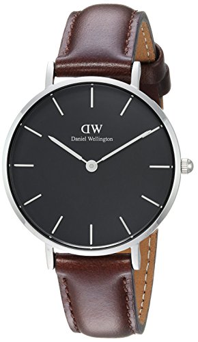 Stainless steel case with a brown leather strap. Fixed stainless steel bezel. Black dial with silver-tone hands and index hour markers. Dial Type: Analog. Quartz movement. Scratch resistant mineral crystal. Pull / push crown. Solid case back. Case size: 32 mm. Case thickness: 6 mm. Round case shape. Band width: 14 mm. Tang clasp. Water resistant at 30 meters / 100 feet. Functions: hour, minute. Casual watch style. Daniel Wellington Classic Petite Bristol Ladies Watch DW00100177.Feature