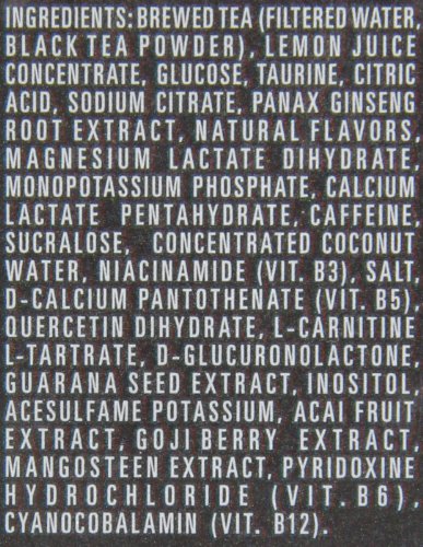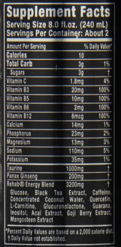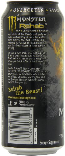 • Monster Rehab energy blend also contains antioxidant rich tea extract, caffeine, maltodextrin, concentrated coconut water, L-carnitine, inositol, glucuronolactone, guarana seed extract, goji berry extract, and acai berry extract