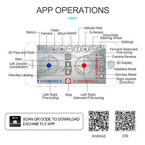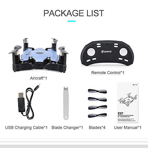 Studio : EACHINE Publisher : EACHINE Product Description Description: Brand name: EACHINE Item name: Eachine E57 RC Quadcopter Product battery: 3.7V 250mAh (Included) Transmitter battry: 2x 1.5V AAA battery (Not included) Charging time: About 45mins Flying time: 5-6mins R/C distance: 30m Color:Blue Camera: 720P Quad's weight: 36g Material: Electronic Components,Plastic Quad's size: 12.5x6.3x2.8cm (the arms not folded) 10x6.3x0.85cm (the arms folded) 10.5cm(Diagonal length) Package size: 16x9.2x5.3cm Package weight: 250g Features: With Auto Foldable Arm,one key open. Innovative selfie drone,720P camera allows you to get great selfies effortlessly. With Ultra-thin body and remote control, small size, easy to carry. With automatic folding design, just need to tap on both sides, and it will automatically eject the arms. With aerial photography beauty mode, let your photo looks more beautiful. Wifi real-time transmission FPV system which can capture photos and record videos for your great memory. With One key return function makes it easily to find the way home. Can be controlled both by transmitter and Mobile phone. It have 3-level flight speed to switch that can make more fun with the flying. It can realize 3D tumbling 360°rolling in four directions with 4 LED lights. The quadcopter fuselage is made of high strength and resistant engineering plastics,lightweight and durable resistance.