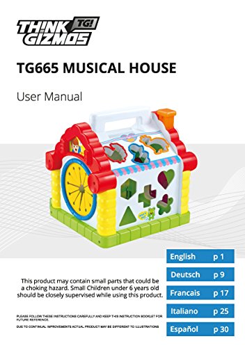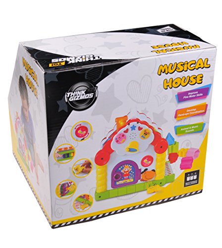 Studio : Think Gizmos Publisher : Think Gizmos Binding : Toy Product Description The Musical House from ThinkGizmos is a super toy from their Awesome Child Development Series which can provide hours of fun and learning for children. 9 different fun activities are built into the Musical House, these include: A Piano, Guess the Shape Game, Key from the Dog Game, Rotate the Moon Game, Unlocking Fun, Learning Maths, Abacus Beads, Shape Matching and Animal Shape Matching. Whist enjoying these activities various sounds will accompany them, the Musical House includes 22 different sounds which include: 6 Animal Sounds, 8 Musical Scales and 8 Pieces of Music. Not only will children enjoy playing with the Musical House they will also be learning and developing at the same time as the activities help to improve Hand-Eye Coordination, Fine Motor Skills, Dexterity and problem solving. As a ThinkGizmos product everything needed to enjoy this toy is provided, including the 2xAA batteries needed for the lights and sounds, branded box and a fully translated manual in 5 languages (English, German, French, Spanish and Italian). The TG665 Musical House is recommended for children aged 18 Months a 'ThinkGizmos' branded product which is a registered trademark in the USA Europe. 0