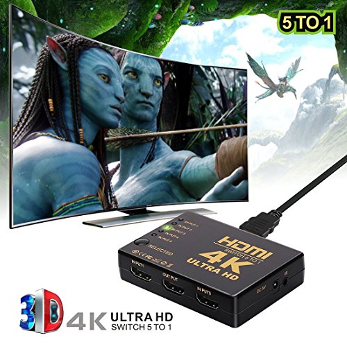 Studio : Redhilly Publisher : Redhilly Binding : Electronics Product Description Redhilly Intelligent MINI HDMI Switch splitter switcher Box audio with remote supports 4K Full HD1080p 3D and is a kind of HDMI switch box 5 in 1 out, for computer PS4 tv etc. ? 5 HDMI Inputs 1 HDMI Output ? Support 4K resolution ? Support 12-bit Deep Color per channel; Max. of 36-bits across all channels ? Support 3D devices ? Support HDCP ? IR Receiver and a Remote Control included ? Perform well with computers, laptops, Blue-Ray players, cable boxes, PS3/PS4, Xbox one/360, Wii U, Chromecast, etc. What you will get: 1 * HDMI switch 4K 1 * USB Power Cable 1 * IR Remote 1 * User Manual Best 4K HDMI Switcher 5 x 1 for your choice!